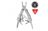 плоскогубці, кусачки, маленька викрутка плоска, ніж, серрейтор, консервний ніж, відкривачка для пляшок, для зняття ізоляції, пила, захоплення для гайок і циліндрів, ножиці, шило, тримач біт, 12 змінних насадок в комплекті